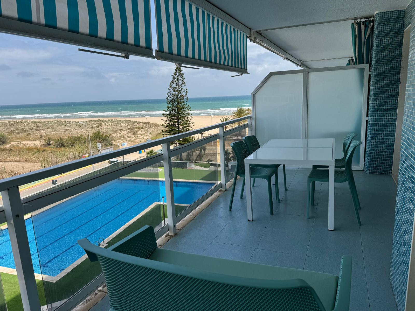 The terrace, next to the living room, is a very important space and we have furnished it with some relax chairs because that is what we came for, to relax in our vacations in Gandia. We also have awnings on the terrace.