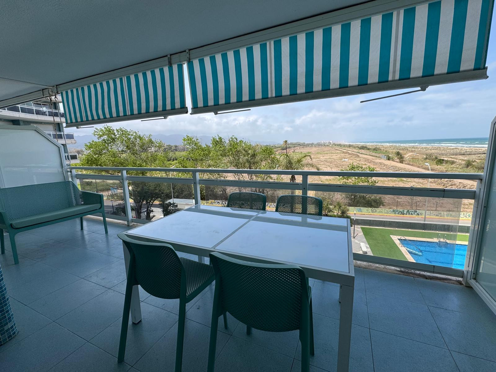 Appartement à Playa de Gandía qui possède 2 chambre(s) et Capacité pour 4 personnes. Logement de 90 m² meublé avec goût et totalement équipé, situé en front de plage, avec vue sur la mer et la montagne. La location se trouve à 5 m de la plage de sable "Playa L´Ahuir", 200 m de la gare routière "Bus local (Playa - Gandia, Gandia - Playa)", 375 m de la plage de sable "Playa Can", 500 m du supermarché "Mas y Mas Supermercado", 7 km de la ville "Centro Histórico Gandia", 7 km de la gare "Estación Tren Gandia", 20 km du domaine de Golf "Oliva Nova Golf", 25 km du parc aquatique "Aquopolis", 30 km de la plage de roche "Les Rotes, Denia", 60 km du parc naturel "La Albufera", 80 km du parc d'attractions "Terra Mítica", 80 km de l'aéroport "Manises, Valencia", 600 km des pistes de ski "Pirineos" et il est situé dans une zone idéale pour familles zone et près de la mer.Elle dispose de ascenseur, jardin, mobilier de jardin, clôture, 15 m² de terrasse, lave-linge, fer à repasser, accès internet (wifi), sèche-cheveux, terrain de tennis, salle de sport, chauffage pompe à chaleur, climatisation, piscine collective, parking couvert même bâtiment, 2 Télévisions, tv satellite (Langues: Espagnol, Anglais, Allemand, Français).La cuisine indépendante, à vitrocéramique, est équipée avec réfrigérateur, micro-ondes, four, congélateur, lave-vaisselle, vaisselle/couverts, ustensiles/cuisine, cafetière, grille pain, bouilloire et presse-agrumes.15 avis